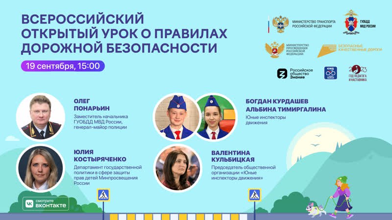 20.09.2023Всероссийский открытый урок о правилах дорожной безопасности для школьников состоится 19 сентября Онлайн–трансляция Всероссийского открытого урока о правилах дорожной безопасности состоится 19 сентября в 15:00. Каждый участник и слушатель урока сможет вспомнить о простых, но важных правилах поведения на дорогах.Гости в студии, среди которых: генерал-майор полиции - Понарьин Олег Евгеньевич – заместитель начальника Главного управления по обеспечению безопасности дорожного движения Министерства внутренних дел Российской Федерации, Костыряченко Юлия Александровна - заместитель директора Департамента государственной политики в сфере защиты прав детей Министерства просвещения Российской Федерации, Кульбицкая Валентина Александровна - председатель Общероссийской общественной детско-юношеской организации по пропаганде БДД «Юные инспекторы движения» и дети – юные инспекторы движения расскажут о том, как правильно и безопасно действовать при переходе по пешеходному переходу, как вести себя в автомобиле в качестве пассажира, а также как безопасно управлять электросамокатом и велосипедом.Урок пройдет в преддверии Олимпиады «Безопасные дороги», а также Всероссийской недели безопасности дорожного движения при поддержке национального проекта «Безопасные качественные дороги».Трансляция урока будет доступна в социальных сетях Национальные проекты России:ВКонтакте: https://vk.com/nationalprojectsru?w=wall-197461611_147447Одноклассники: https://ok.ru/nationalprojectsru/topic/155756355122149 А также в соцсетях Российское общество «Знание» (https://vk.com/znanierussia) Пройти Олимпиаду «Безопасные дороги» можно с 19 сентября по 15 октября включительно - https://dorogi.uchi.ru/