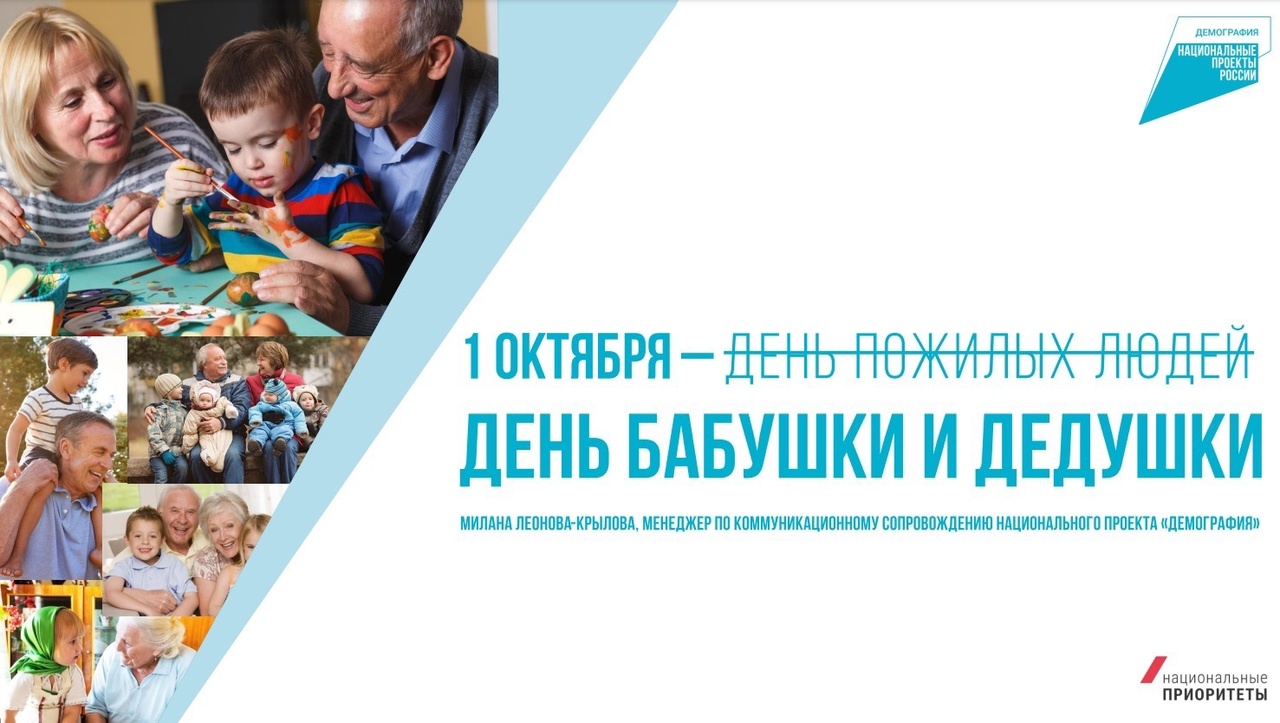 1 октября в Международный день пожилого человека в России впервые проведут акцию «День бабушки и дедушки», при поддержке национального проекта «Демография».У нас не всегда получается достаточно часто видеться с нашими старшими родственниками. Хотя это общение крайне важно для всех поколений. По мнению специалистов, позитивные эмоции от общения с детьми помогают значительно улучшить ментальное здоровье и продлить жизнь людей старшего возраста. А детям любовь и забота старших родственников помогают гармонично развиваться и расти.Сделайте этот день теплее, проведите его со своими бабушками и дедушками, а если они далеко – позвоните и поздравьте с праздником!В рамках акции «День бабушки и дедушки» по всей стране пройдут праздничные мероприятия. Их смогут посетить все желающие – люди старшего возраста, дети и их родители. Мероприятия пройдут в общественных пространствах городов, в Центрах социального обслуживания населения, Центрах долголетия и культурных организациях. Участники акции «День бабушки и дедушки» смогут посетить концерты коллективов людей старшего возраста, посоревноваться в спортивных мероприятиях, научиться новому в творческих мастер-классах и многое другое.
