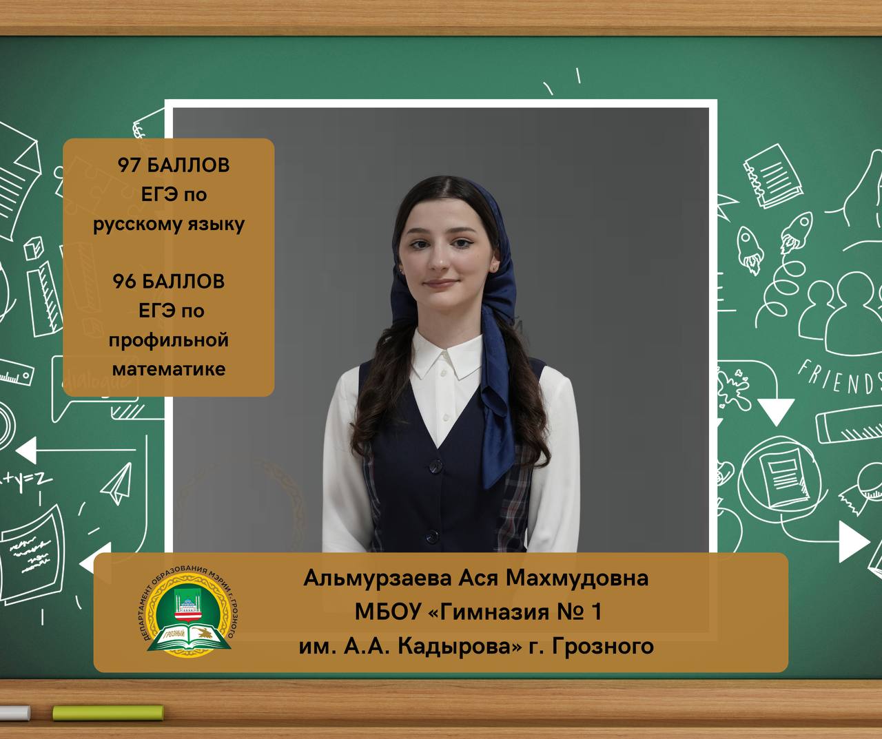 Альмурзаева Ася Махмудовна, ученица МБОУ «Гимназия № 1 имени А.А. Кадырова» г. Грозного, набрала на ЕГЭ 97 баллов по русскому языку и 96 баллов по профильной математике.