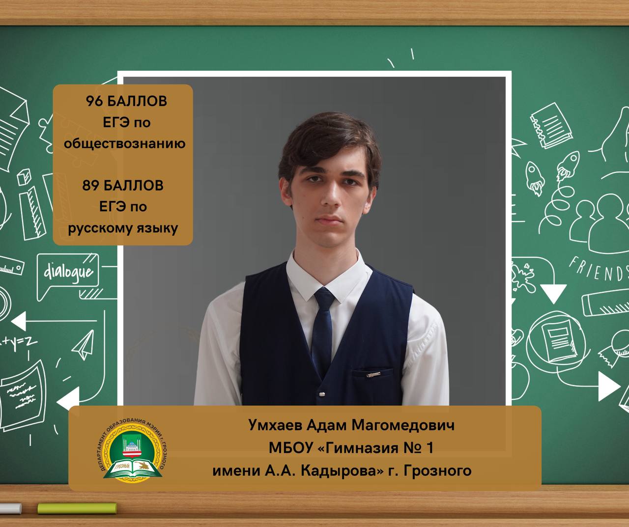 01.07.2024Умхаев Адам Магомедович, ученик МБОУ «Гимназия № 1 имени А.А. Кадырова» г. Грозного, набрал на ЕГЭ 96 баллов по обществознанию и 89 баллов по русскому языку.