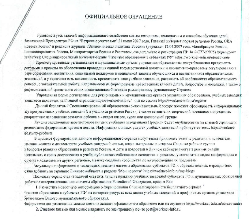 04.11.2017Руководствуясь задачей информационного содействия новым методикам, технологиям и способам обучения детей, обозначенной Президентом РФ на "Встрече с учителями" 21 июня 2017 года, Главный интернет портал регионов России, ОИА "Новости России" и редакция журнала «Экономическая политика России» (учрежден 12.04.2007 года Минобрнауки России, Минэкономразвития России, Минпромторгом России и Росстатом, свидетельство о регистрации ПИ № ФС77-27975) формируют бесплатный Специализированный интернет-сервис "Развитие образования в субъектах РФ" https://worknet-info.ru/obrazovanie