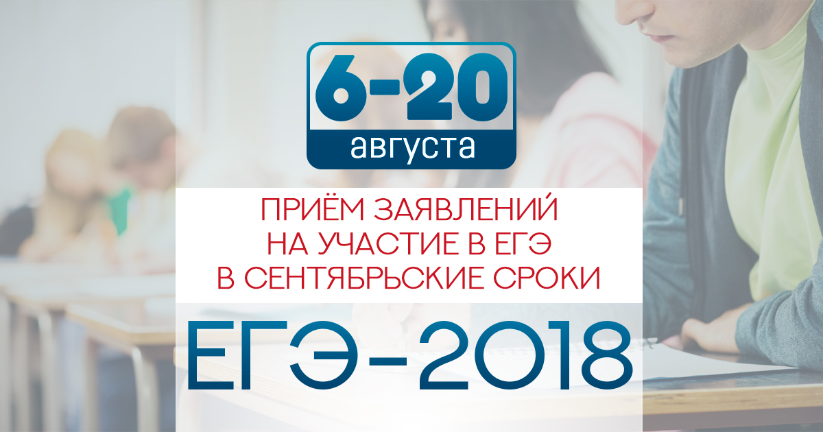 Федеральная служба по надзору в сфере образования и науки напоминает о сроках подачи заявлений на участие в едином государственном экзамене в сентябрьские сроки. Прием заявлений осуществляется с 6 по 20 августа включительно. Заявления подаются в места регистрации, определяемые региональными органами управления образованием.