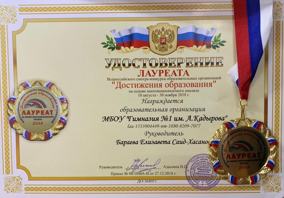 Подведены итоги мероприятия «Всероссийский смотр-конкурс образовательных организаций «ДОСТИЖЕНИЯ ОБРАЗОВАНИЯ» на основе многокомпонентного анализа».Смотр конкурс проводился на базе открытой публичной выставочной интернет-площадке: http://достиженияобразования.рфВ мероприятии приняли участие 34186 участников (образовательных учреждений).В их числе и наша Гимназия представила материалы о ее деятельности, ее истории, педагогическом коллективе, показатели и результаты работы организации в целом по всем образовательным областям. В результате чего нам присвоено звание «ЛАУРЕАТ — ПОБЕДИТЕЛЬ» «Всероссийский смотр-конкурс образовательных организаций "ДОСТИЖЕНИЯ ОБРАЗОВАНИЯ" на основе многокомпонентного анализа» проводился в один заочный этап с 10 августа по 11 декабря 2018 г. в формате открытой публичной выставочной интернет-площадки на всероссийском уровне.С целью:- выявления лучших образовательных организаций РФ на основе многокомпонентного анализа;- обобщения и распространения опыта работы образовательных организаций;- укрепления материально-технической базы образовательных организаций, вошедших в число призёров, на основе привлечения спонсорских средств предприятий РФ, внебюджетных средств, средств призового фонда мероприятия;- популяризации инновационных подходов в образовательной и воспитательной деятельности системы образования РФ.